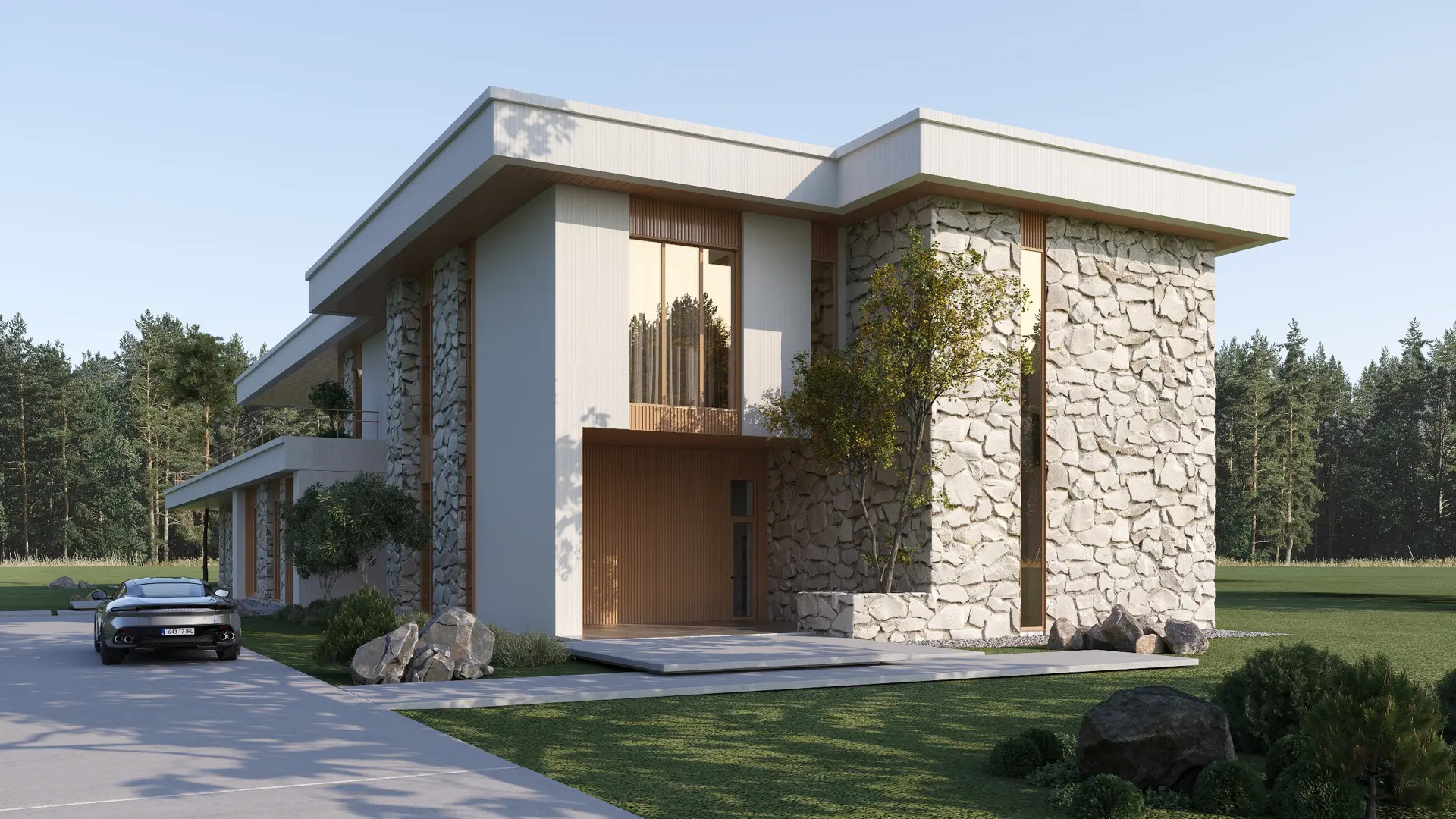 Фасады построены на сочетании рельефной светлой штукатурки, крупного натурального камня и тёплого дерева оттенка золотистого дуба. Контраст фактур делает архитектуру выразительной, но сдержанной. Камень придаёт дому устойчивость и связь с землёй, дерево добавляет тепла, а светлые плоскости усиливают ощущение воздуха и света.