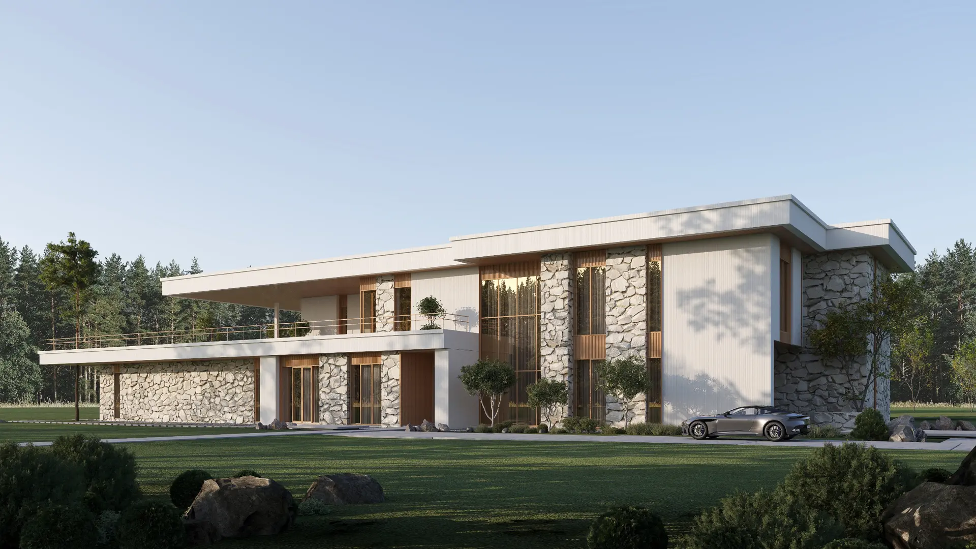 Резиденция у реки — это дом, в котором архитектура мягко встраивается в природный ландшафт и становится его продолжением. Строгие горизонтальные линии подчёркивают спокойный характер места, а открытые террасы и панорамное остекление стирают границу между интерьером и окружающей средой. Дом раскрывается в сторону света, зелени и воды, создавая ощущение простора и тишины.