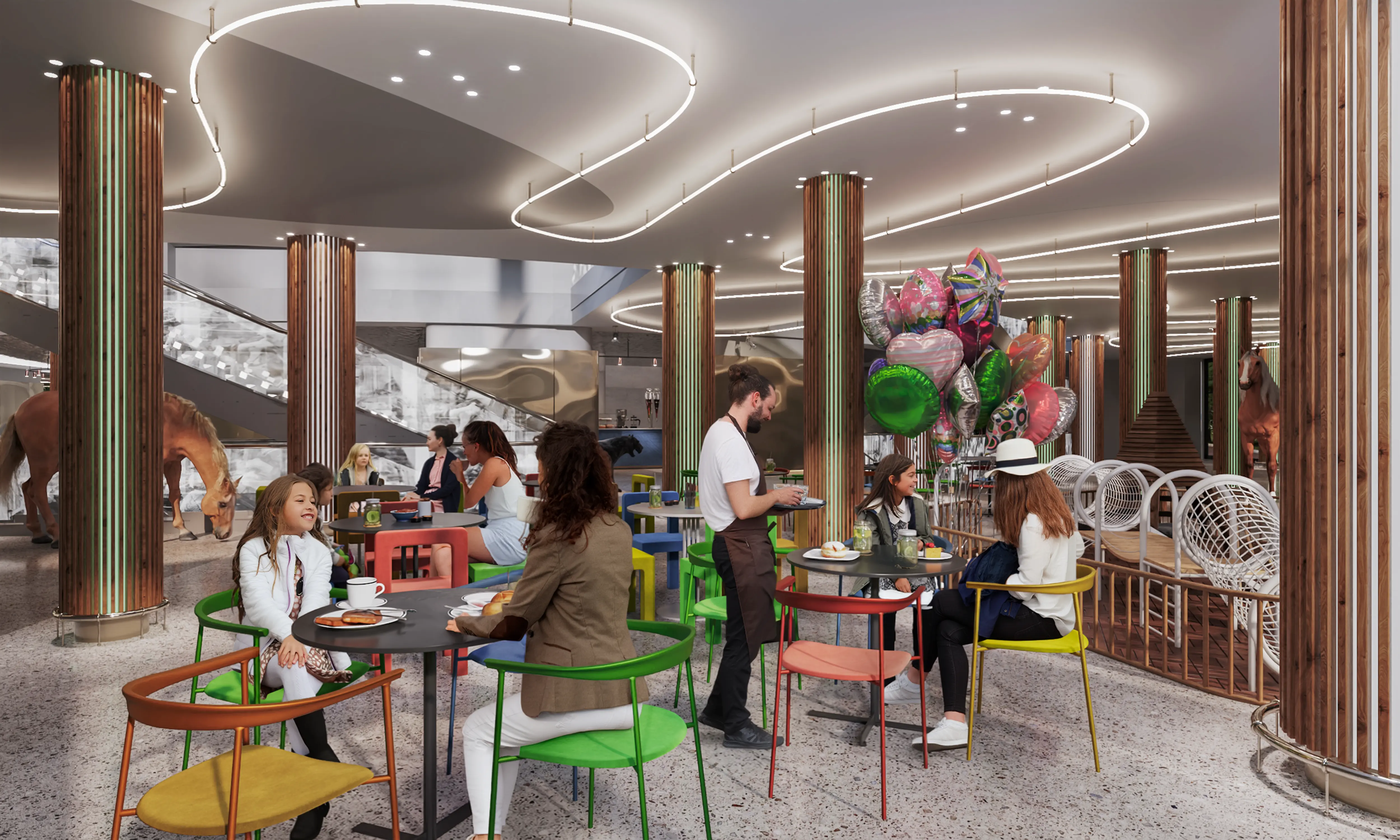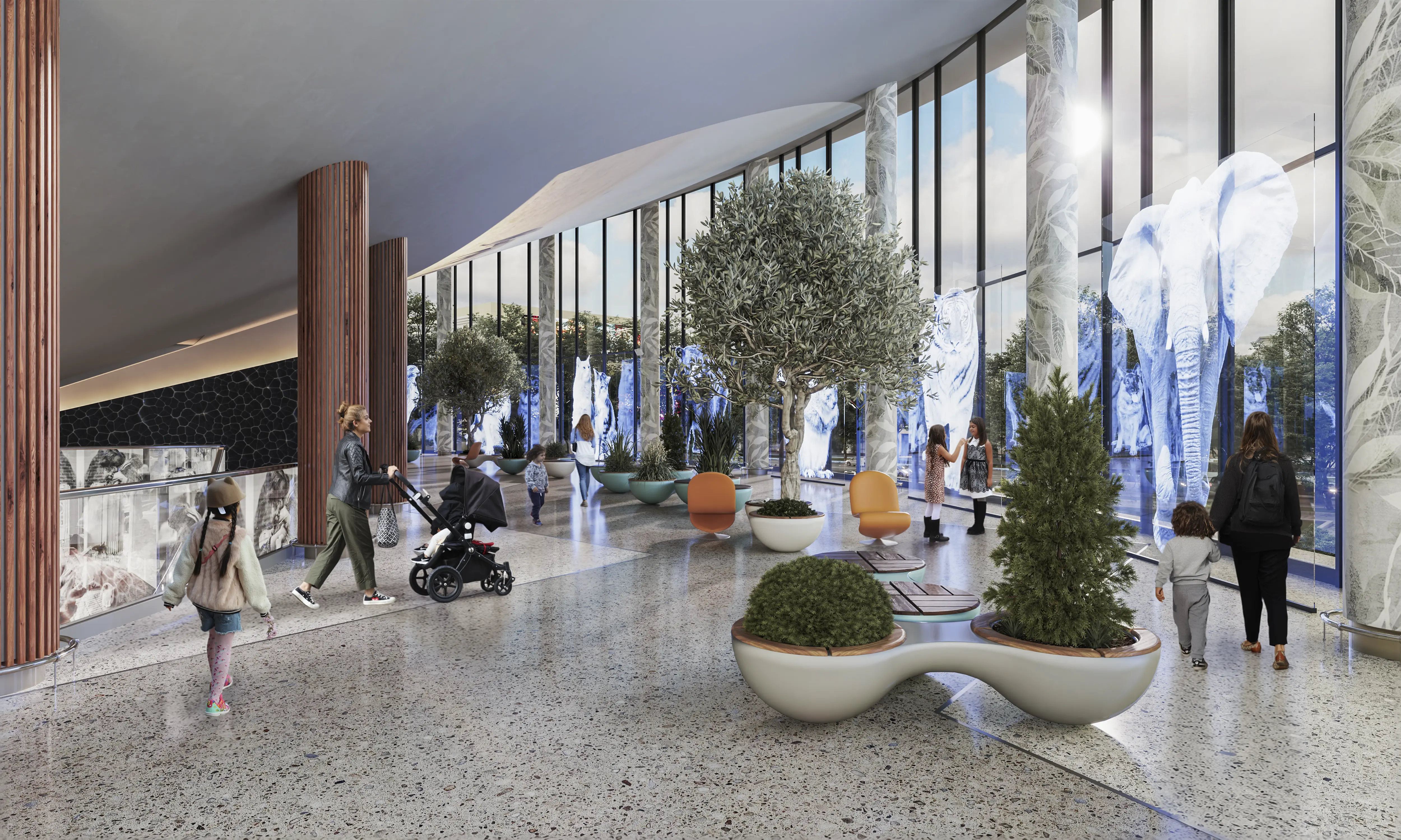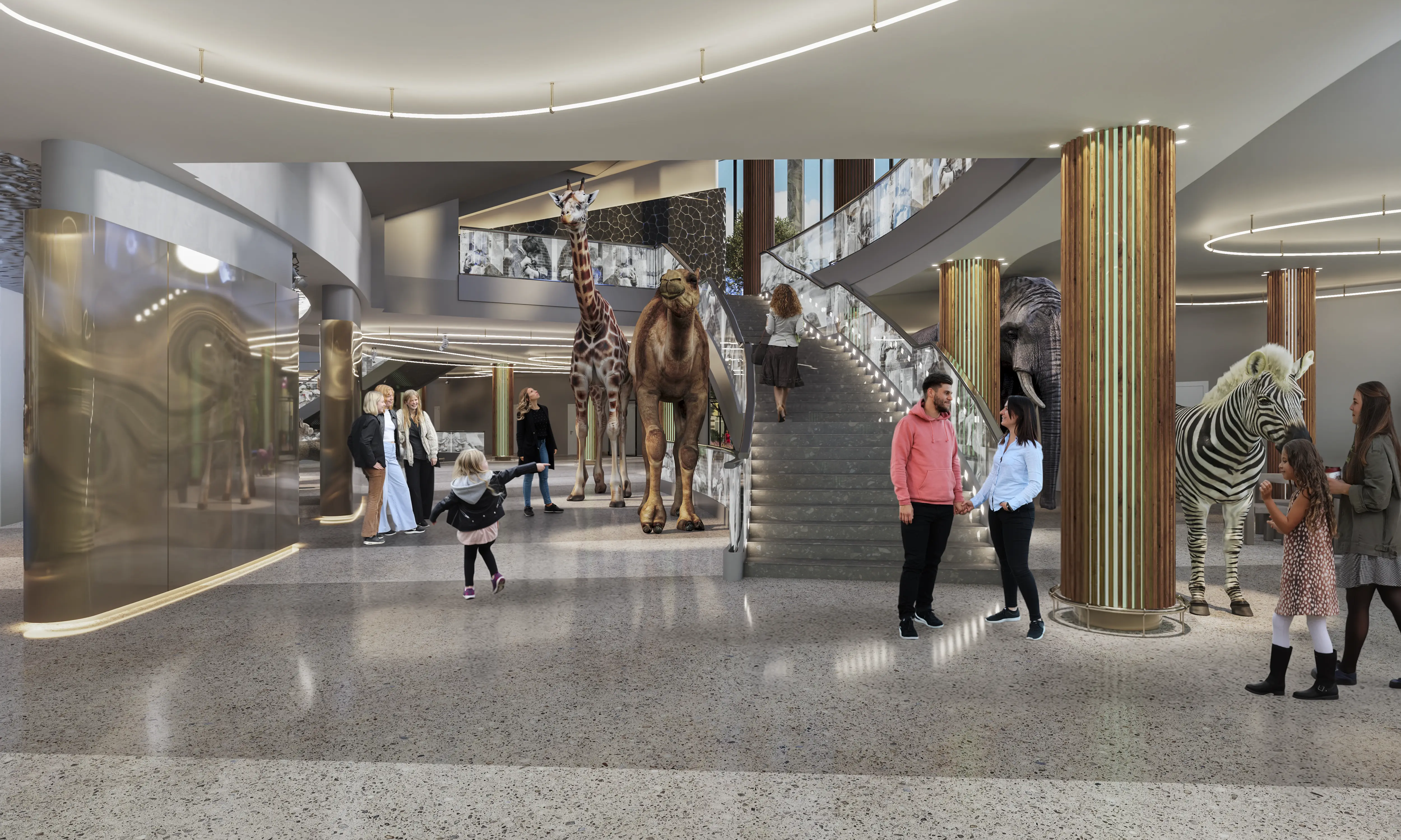 Интерьер полностью преобразился: современные материалы, уютная кофейня, детские зоны и фигуры животных в вестибюле формируют атмосферу приключения с первых шагов. Мы работали с этим проектом как с наследием, которое важно сохранить, и как с пространством, которое можно раскрыть заново.