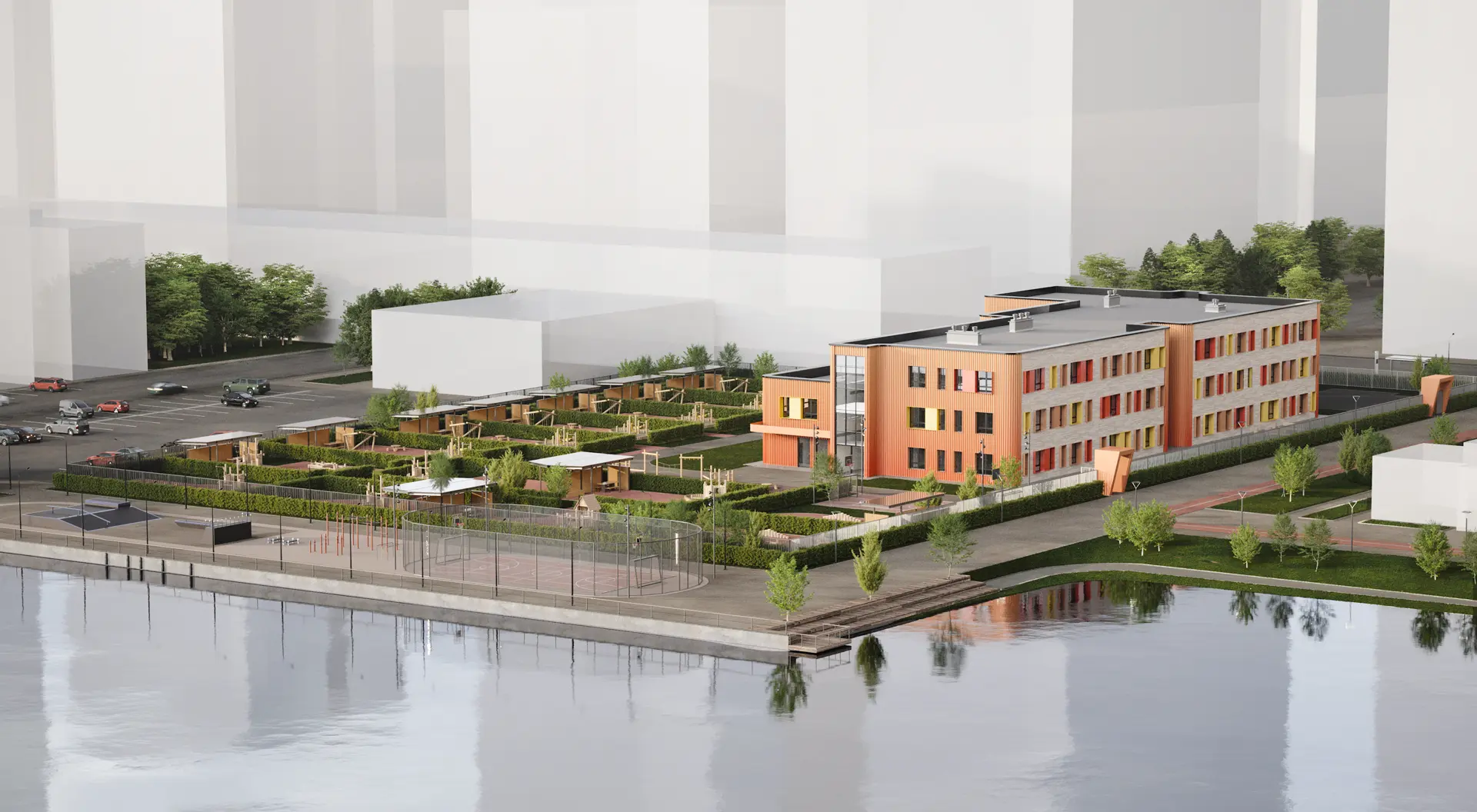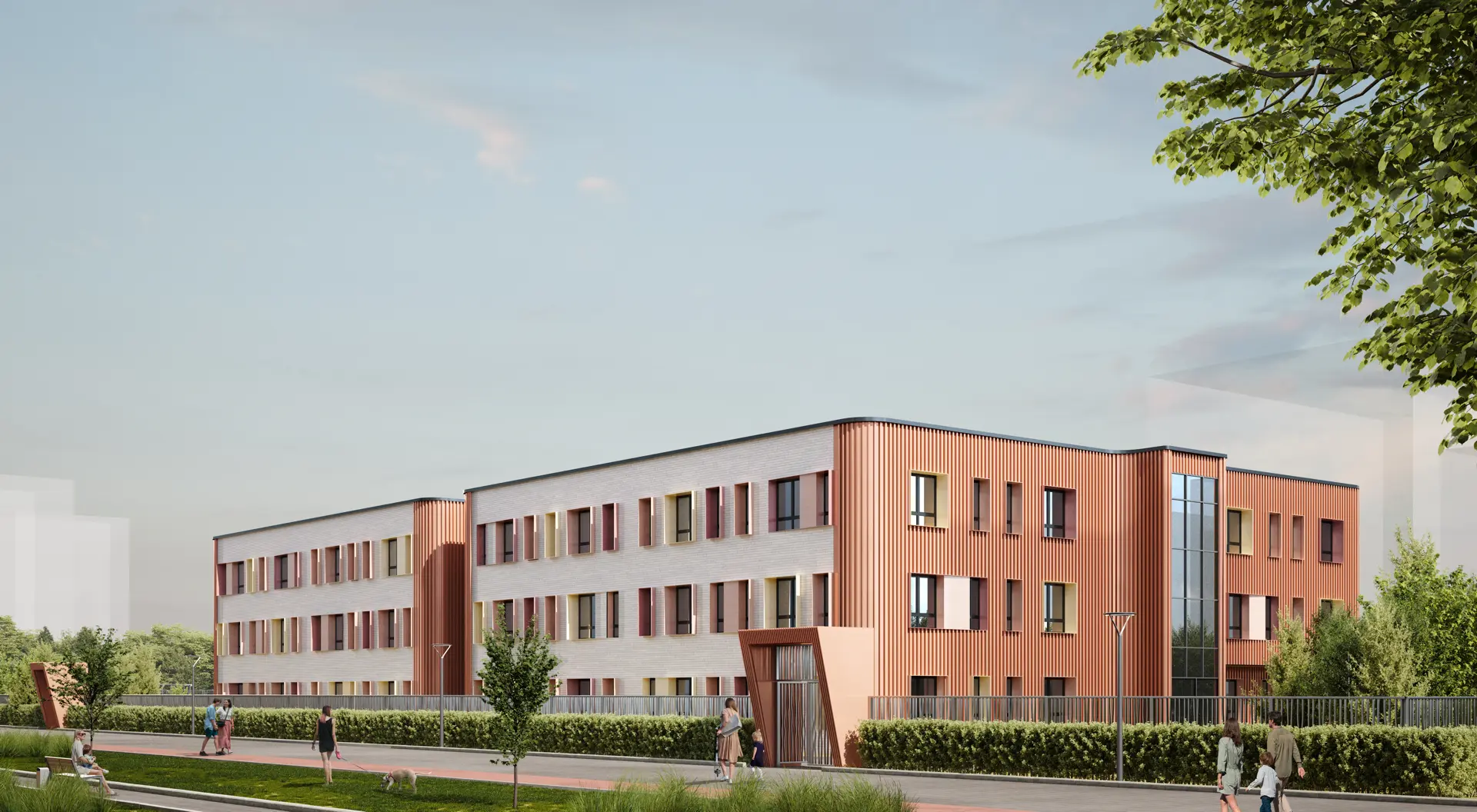 The architectural concept is built on a balance of warm natural tones (terracotta, wood, light brick) and playful window frame accents. These colorful elements make the façade vibrant and help children navigate the space intuitively. The building’s simple, clean form is enhanced by rhythmic window placement and soft, rounded corners.